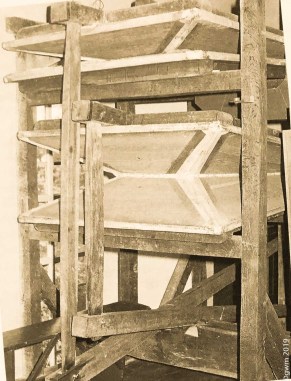 Nun, das Ergebnis ist dieser Schwimmerbalg, der innen mit 8 Rahmen, die mittels Gummituchscharnier sowohl mit dem Boden als auch der Deckplatte verbunden sind und dadurch der Deckel total parallel nach oben aufgeht. Also auch ein Deplazieren der Gewichte, was hier mehrfach geschah, wird dieser Balg nicht mit schiefgängigem Hochfahren der Deckelplatte quittieren. Der Winddruck des Motors von 200mmWS muss durch diesen Balg auf rund 150mmWS reduziert werden, bevor der Wind weiter in die beiden Magazinbälge geleitet wird. Daher werden wir das extra starke Gummituch doppelt genäht einsetzen.